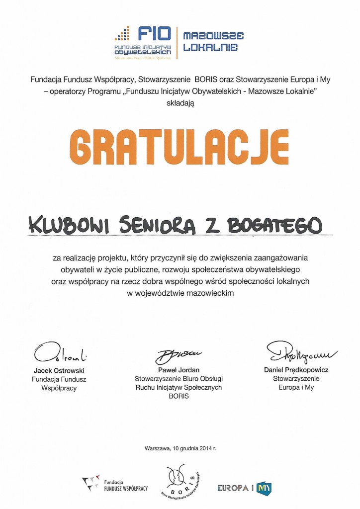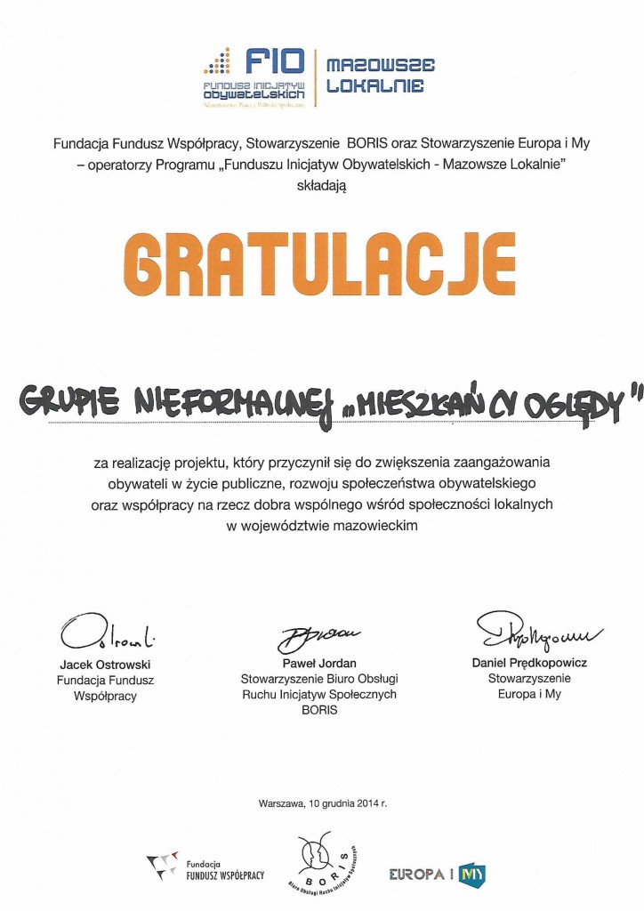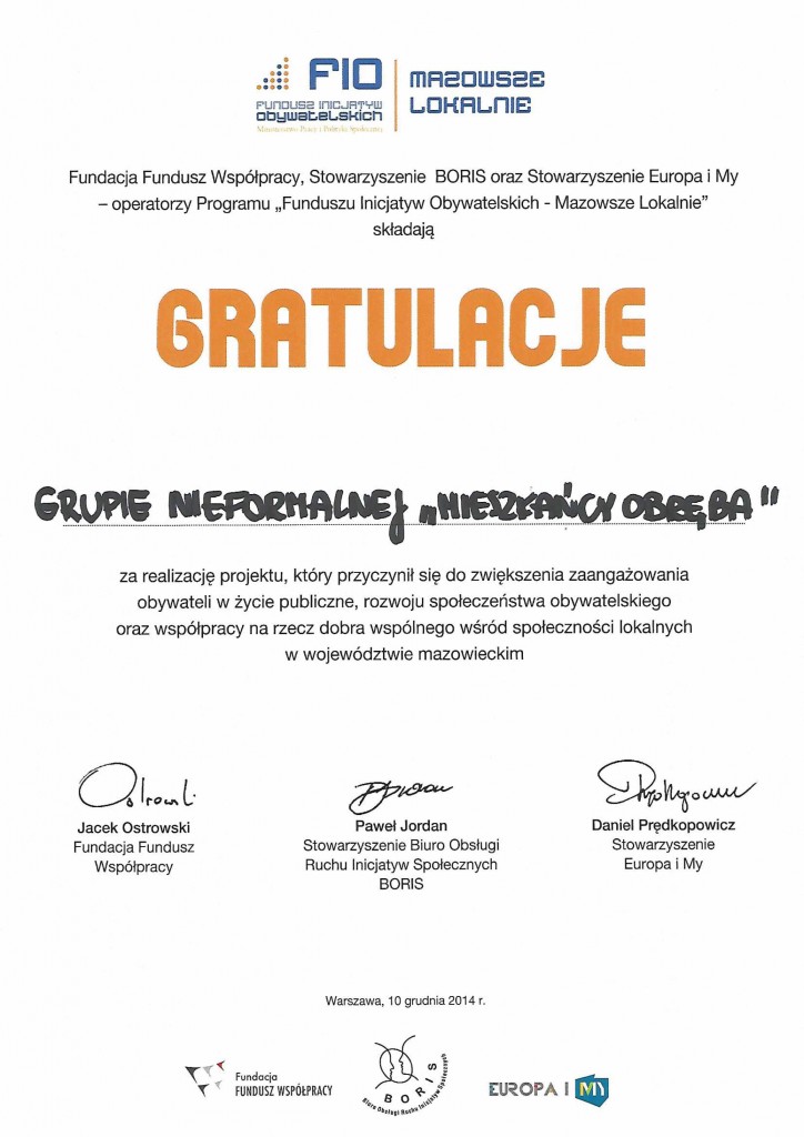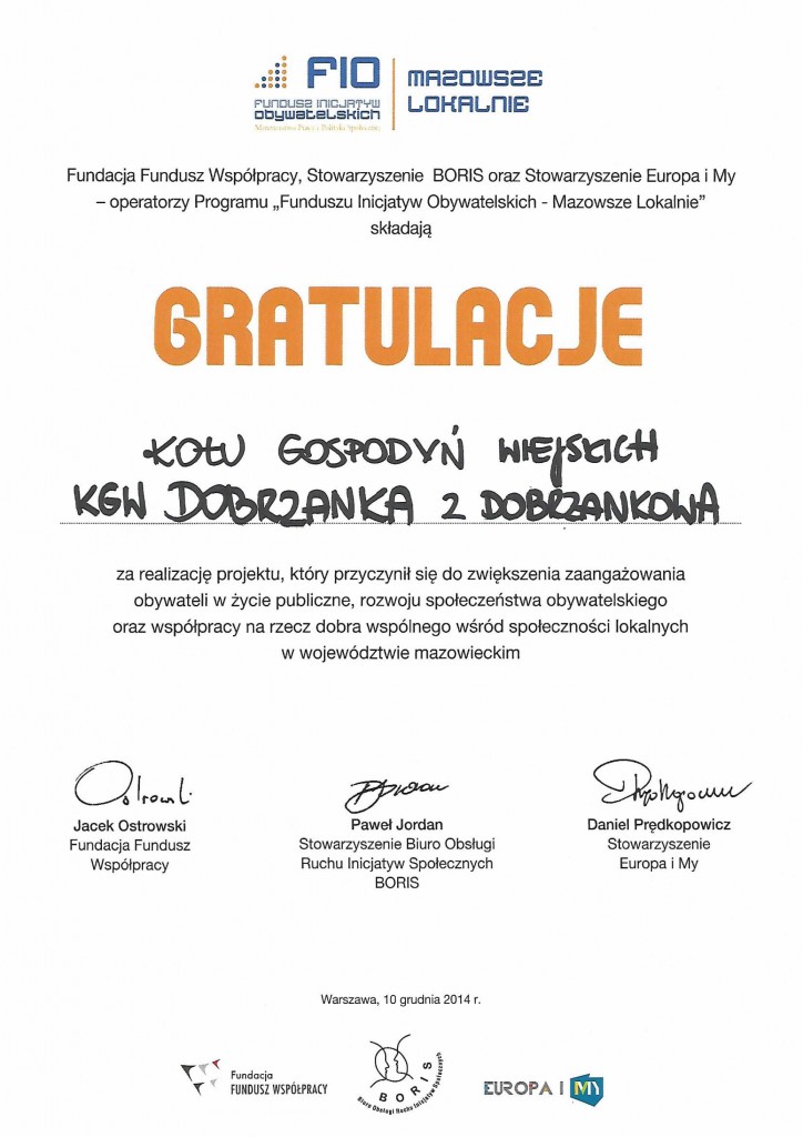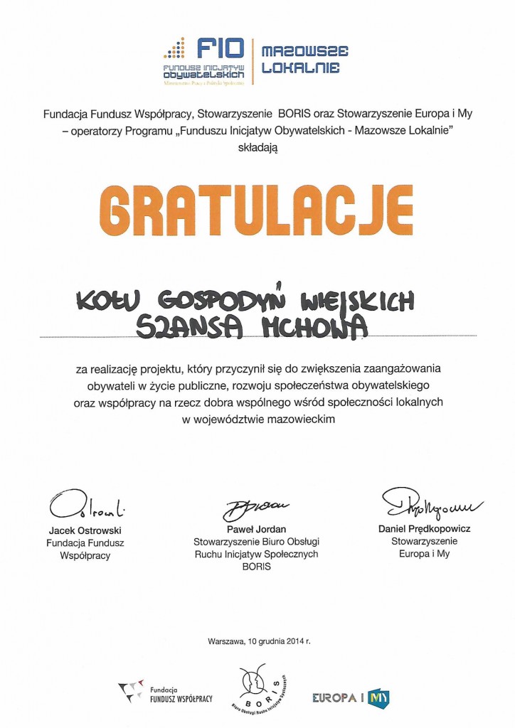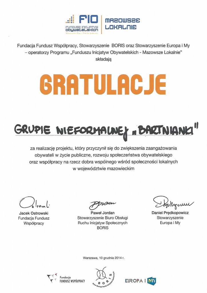 Wszystkie grupy nieformalne z terenu gminy Przasnysz, które uzyskały dofinansowanie z programu FIO Mazowsze Lokalnie, otrzymały specjalne podziękowania za udział w programie i zrealizowanie zaplanowanych działań.