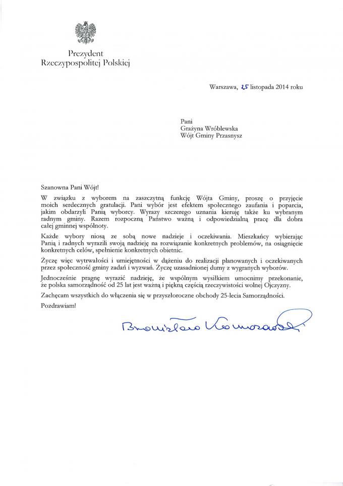 Prezydent Rzeczypospolitej Polskiej Bronisław Komorowski przesłał osobiste gratulacje na ręce wójt Grażyny Wróblewskiej za zaufanie, którym obdarzyli ją mieszkańcy gminy Przasnysz i możliwość sprawowania swojej misji przez kolejne cztery lata.