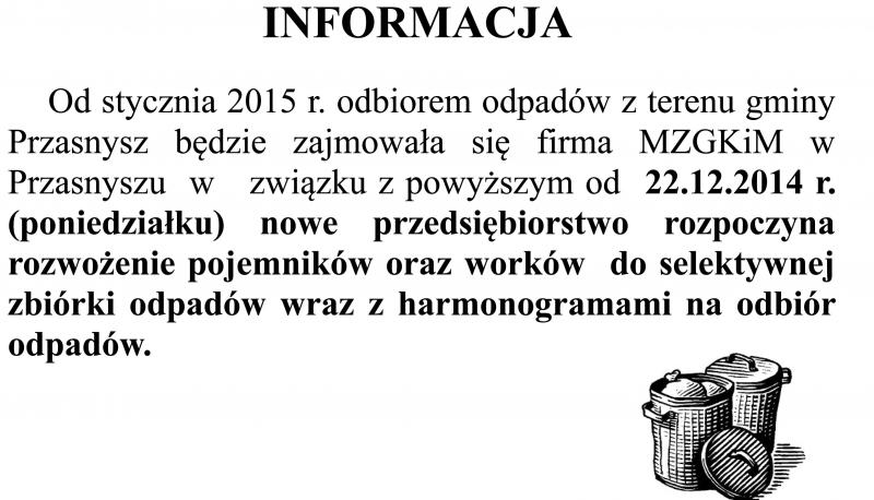 Informacja Urzędu Gminy Przasnysz o rozstrzygnięciu przetargu na wywóz nieczystości stałych z terenu gminy i rozwożenia nowych pojemników na śmieci dla mieszkańców indywidualnych.