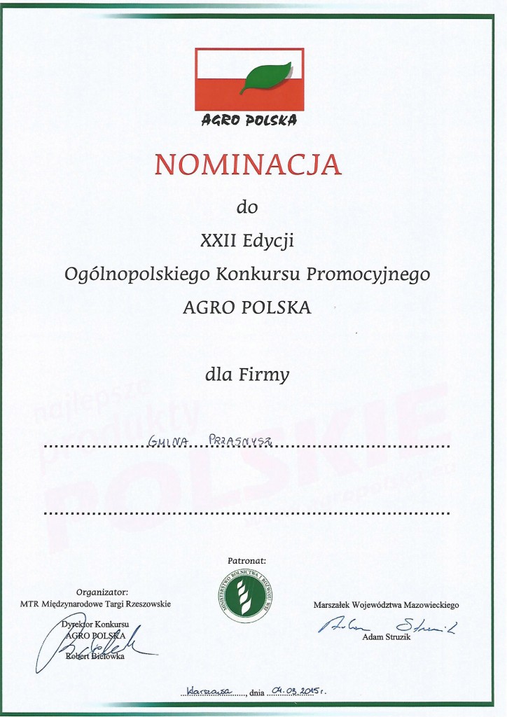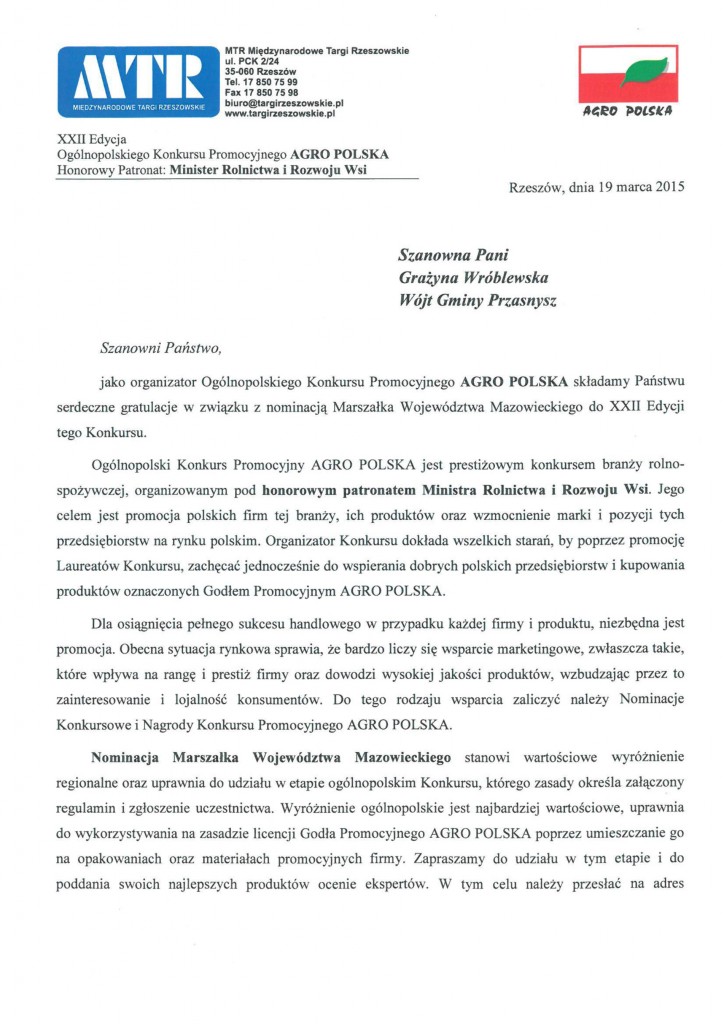 Już niebawem Gmina Przasnysz weźmie udział w ogólnopolskim konkursie promocyjnym AGRO POLSKA, który rokrocznie jest organizowany przez Międzynarodowe Targi Rzeszowskie. Nominację do tego konkursu przyznał naszej gminie marszałek Mazowsza Adam Struzik.
