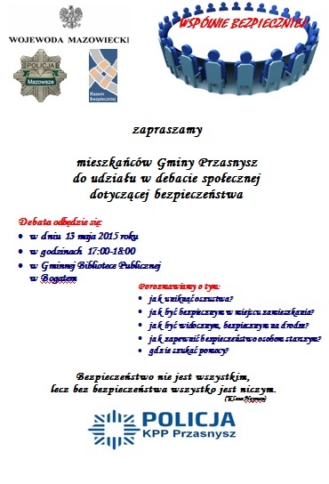 W najbliższy wtorek, 13 maja, w siedzibie Gminnej Biblioteki Publicznej im. J. Narzymskiego w Bogatem odbędzie się debata społeczna poświęcona stanowi bezpieczeństwa publicznego w gminie Przasnysz. Na spotkaniu obecni będą przedstawiciele Komendy Powiatowej Policji z Przasnysza, a także władze samorządowe.