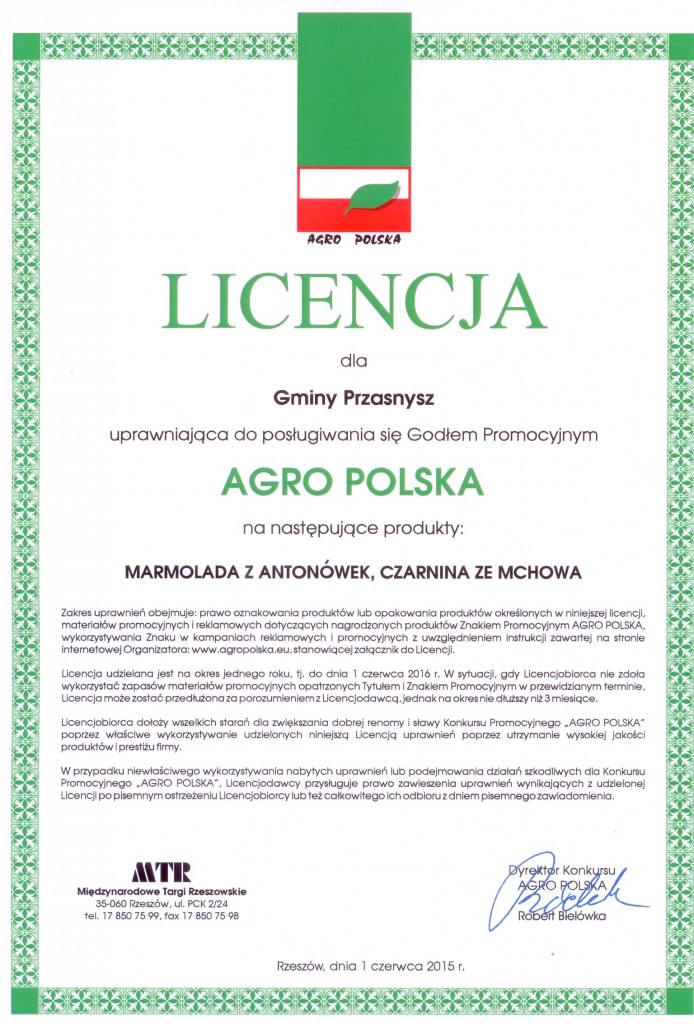 Oto oficjalna licencja otrzymana przez Gminę Przasnysz na posługiwanie się godłem promocyjnym konkursu w odniesieniu do dwóch produktów regionalnych z naszego terenu - marmolady z antonówek oraz czarniny pochodzącej ze wsi Mchowo. Dzięki temu dokumentowi produkty regionalne z gminy Przasnysz mogą być rozpoznawalne w całym kraju.