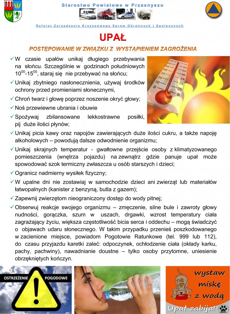 Poniżej prezentujemy też ulotkę informacyjną, jak postępować w trakcie upału, by uniknąć zagrożenia zdrowia i życia.