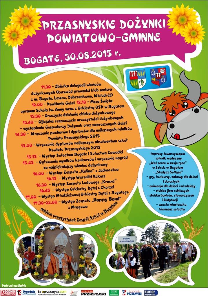 Już w niedzielę, 30 sierpnia, w Bogatem odbędą się doroczne Dożynki Powiatowo-Gminne, organizowane wspólnie przez Gminę Przasnysz i Starostwo Powiatowe w Przasnyszu. Zapraszamy wszystkich do udziału w tym święcie plonów i skorzystania z przygotowanych atrakcji.