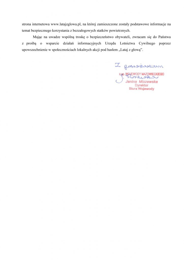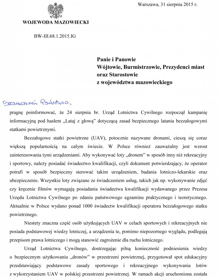 Po koniec sierpnia Urząd Lotnictwa Cywilnego rozpoczął kampanię informacyjną skierowaną do właścicieli popularnych dronów, które zgodnie z prawem są nazywane bezzałogowymi statkami powietrznymi. Oto pełna treść pisma skierowanego do wszystkich mieszkańców Mazowsza: