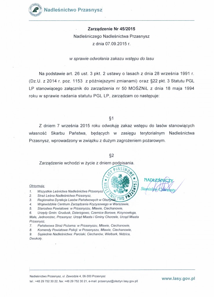 Oto treść zarządzenia Nadleśniczego Nadleśnictwa Przasnysz w tej sprawie: