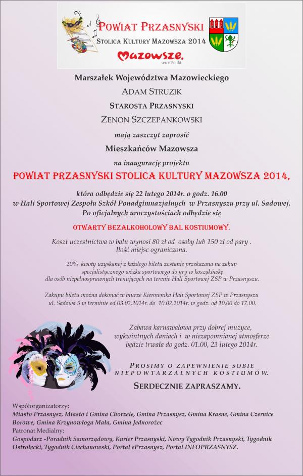 Już 22 lutego w siedzibie Zespołu Szkół Ponadgimnazjalnych w Przasnyszu odbędzie się inauguracja projektu "Stolica Kulturalna Mazowsza 2014", w którym udział biorą wszystkie gminy powiatu przasyskiego, w tym również Gmina Przasnysz.