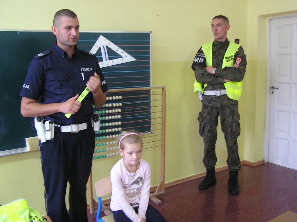 Policjanci przypomnieli dzieciom zasady dotyczące bezpiecznego poruszania się po drogach, zasady bezpieczeństwa w życiu codziennym oraz w autobusie szkolnym. Przeprowadzili także praktyczne ćwiczenie prawidłowego przechodzenia przez jezdnię, omówili bezpieczną jazdę na rowerze oraz zapoznali ze znakami drogowymi.