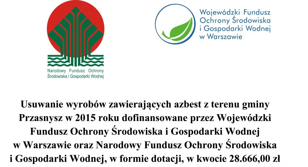 Niemal 30 tysięcy złotych udało się pozyskać Gminie Przasnysz na realizację programu związanego z usuwaniem materiałów zawierających niebezpieczny azbest. To efekt dofinansowania z Narodowego Funduszu Ochrony Środowiska i Gospodarki Wodnej oraz Wojewódzkiego Funduszu Ochrony Środowiska i Gospodarki Wodnej.