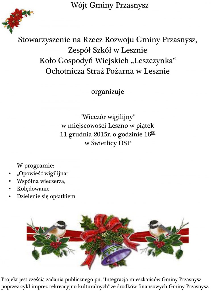 Wójt Gminy Przasnysz, Stowarzyszenie na Rzecz Rozwoju Gminy Przasnysz, Zespół Szkół w Lesznie, Koło Gospodyń Wiejskich „Leszczynka”, Ochotnicza Straż Pożarna w Lesznie zapraszają wszystkich mieszkańców gminy Przasnysz na wieczór wigilijny, który odbędzie się w świetlicy wiejskiej przy OSP w piątek, 11 grudnia, o godzinie 16.00.
