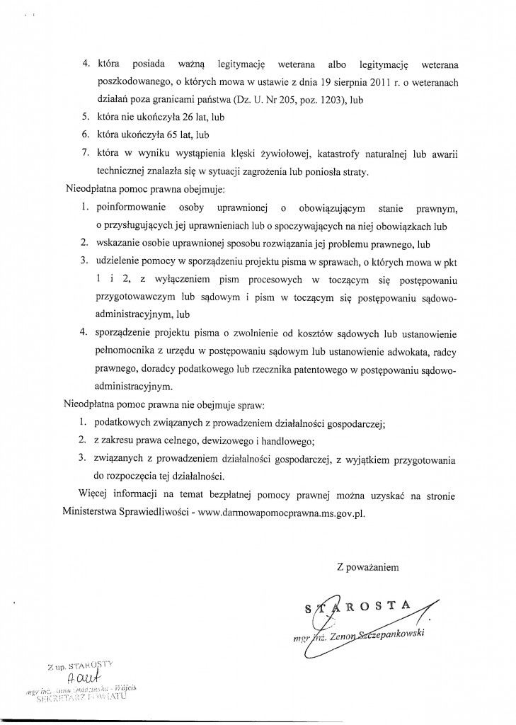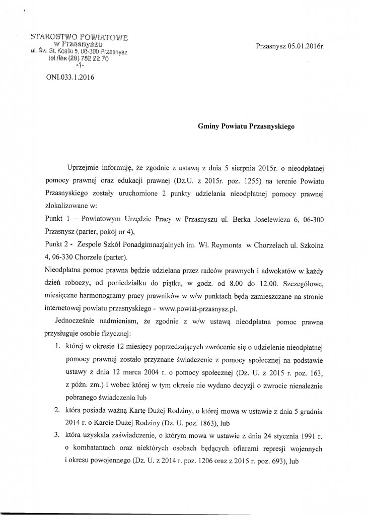 Od 1 stycznia 2016 roku na terenie powiatu przasnyskiego świadczona jest bezpłatna pomoc prawna dla mieszkańców. Pierwszy z nich mieści się w siedzibie Powiatowego Urzędu Pracy w Przasnyszu, drugi - w Zespole Szkół Ponadgimnazjalnych w Chorzelach.