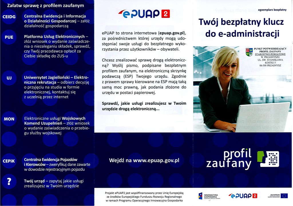 Starostwo Powiatowe w Przasnyszu informuje, że wszyscy obywatele zainteresowani korzystaniem z elektronicznego dostępu do usług administracji publicznej mogą uzyskiwać profil zaufany (niezbędny do korzystania z tego typu usług) w siedzibie Starostwa Powiatowego – ul. św. St. Kostki 5 06-300 Przasnysz, pok. nr 27.