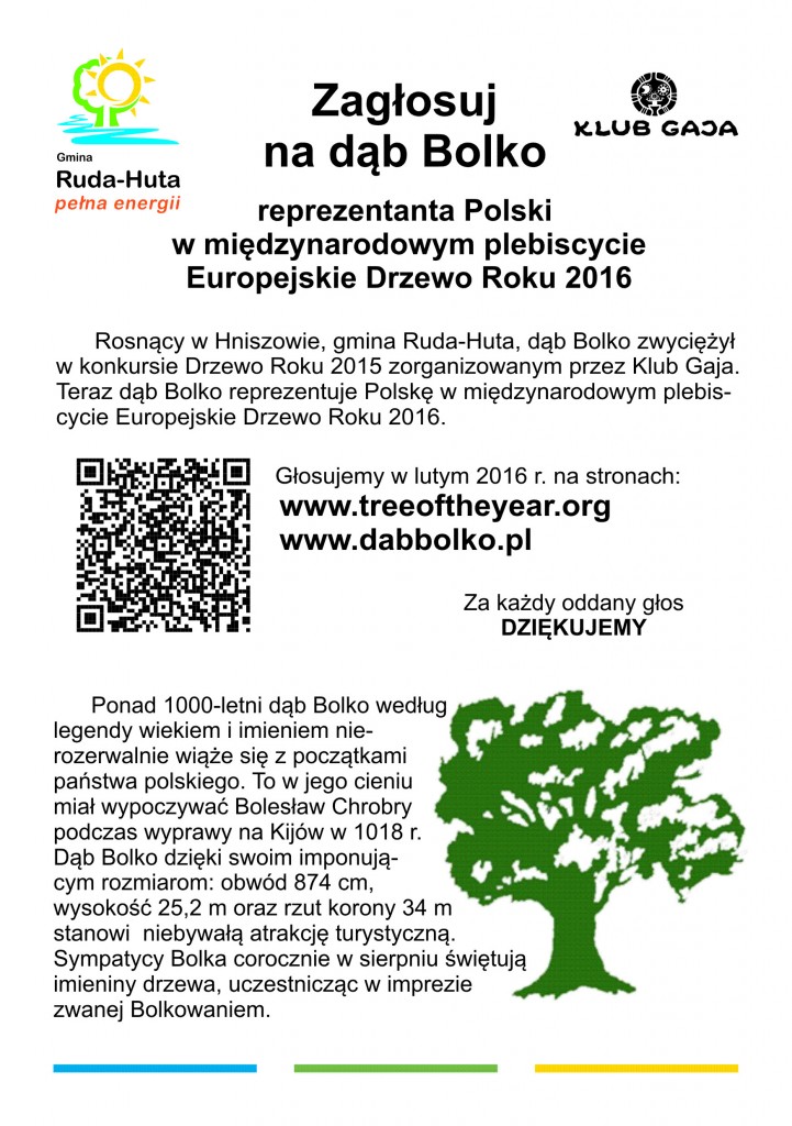 Rosnący w gminie Ruda-Huta Dąb Bolko jest polskim kandydatem do tytułu "Europejskie Drzewo Roku 2016" w plebiscycie organizowanym przez koalicję organizacji ekologicznych. W lutym trwać będzie głosowanie internetowe na najpiękniejszy okaz rosnący w Europie. Dzięki internautom może to być właśnie polskie drzewo.