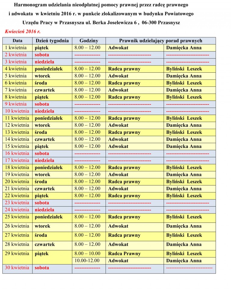 Poradnictwo prawne - grafik na kwiecień