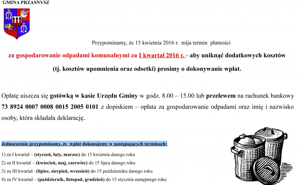 Urząd Gminy Przasnysz przypomina wszystkim mieszkańcom gminy o zbliżającym się terminie opłat za odbiór odpadów komunalnych z terenu gospodarstw indywidualnych za I kwartał 2016 roku. Termin ten upływa 15 kwietnia.