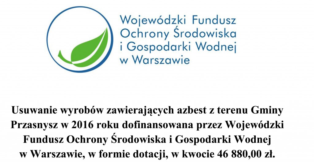 Działania w gminie Przasnysz związane z usuwaniem azbestu z terenu gospodarstw indywidualnych zostały dofinansowane ze środków Wojewódzkiego Funduszu Ochrony Środowiska i Gospodarki Wodnej w Warszawie. Wysokość dotacji z WFOŚiGW wyniosła 46 880 złotych.