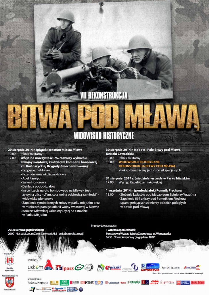 Tegoroczne widowisko jest już siódmą edycją rekonstrukcji i organizowanych od 2008 roku. Najpierw w piątek, sierpnia 2014 roku (piątek), w centrum Mławy odbędą się oficjalne uroczystości 75. rocznicą wybuchu II wojny światowej z udziałem 20. Bartoszyckiej Brygady Zmechanizowanej. Dzieci i koneserów militariów zainteresuje piknik militarny na Starym Rynku. Od godziny 17.00 rozpoczną się oficjalne uroczystości (Apel Pamięci, Salwa honorowa, defilada). Wojskowi przygotowali dla nas niebywałą niespodziankę. Wspólnie dla widzów zaśpiewają wojskową pieśń, ale i zaprezentują – po raz pierwszy w Mławie – pokaz musztry paradnej. Punktem kulminacyjnym ma być wzruszające widowisko utrzymane w konwencji teatru ulicznego – „Tym co z wojną odchodzą za młodzi”.