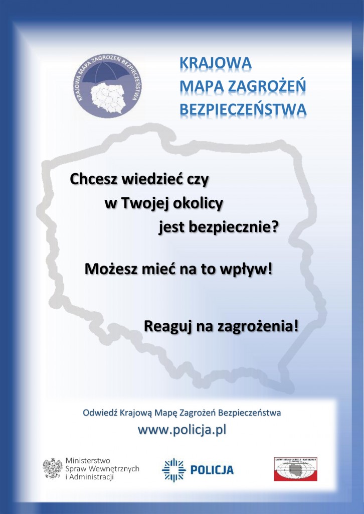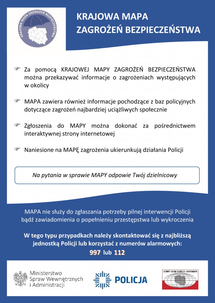 Należy pamiętać, że zgłoszenia w ramach Krajowej Mapy Zagrożeń Bezpieczeństwa nie zastępują potrzeby pilnej interwencji Policji. W tego typu przypadkach należy korzystać z numerów alarmowych 112, 997.