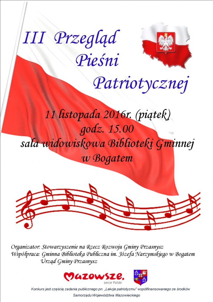 Zapraszamy na III Przegląd Pieśni Patriotycznej, który odbędzie się w Dniu Niepodległości, 11 listopada, o godzinie 15.00 w siedzibie Gminnej Biblioteki Publicznej im. J. Narzymskiego w Bogatem.