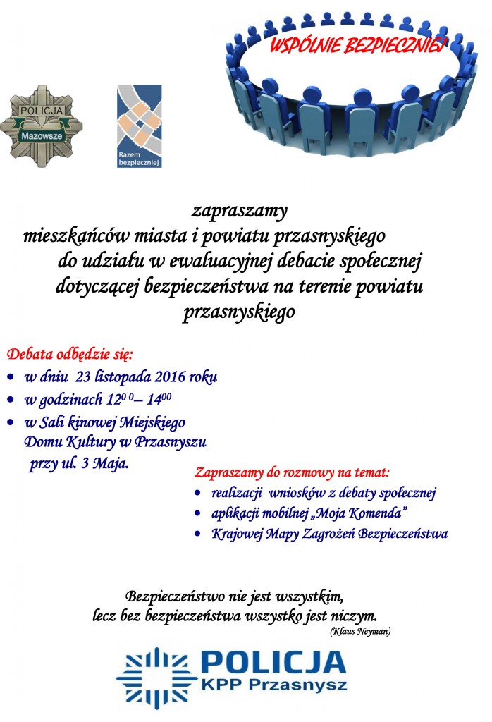 Komendant powiatowy policji w Przasnyszu zaprasza wszystkich mieszkańców gminy Przasnysz do udziału w ewaluacyjnej debacie społecznej na temat bezpieczeństwa na terenie powiatu. Debata odbędzie się 23 listopada w sali kinowej Miejskiego Domu Kultury w Przasnyszu. Początek - godz. 12.00.