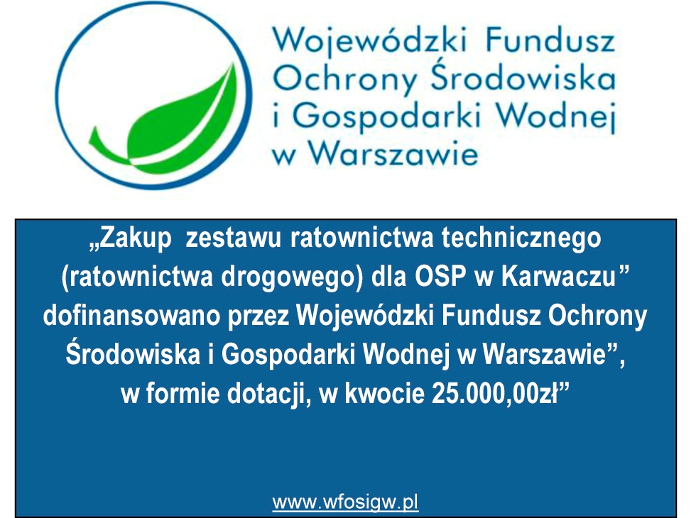 Ochotnicza Straż Pożarna w Karwaczu wzbogaciła się o nowy sprzęt ratowniczy. Środki na zakup nowego zestawu do ratownictwa drogowego wyasygnowała Gmina Przasnysz we współpracy z instytucjami zewnętrznymi. Całkowity koszt projektu w tym zakresie wyniósł 59.286,00  złotych.