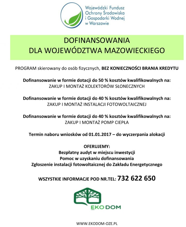 Wojewódzki Fundusz Ochrony Środowiska i Gospodarki Wodnej w Warszawie informuje o możliwości uzyskania dotacji na montaż instalacji proekologicznych w gospodarstwach indywidualnych: kolektorów słonecznych, pomp ciepła oraz instalacji fotowoltaicznych.