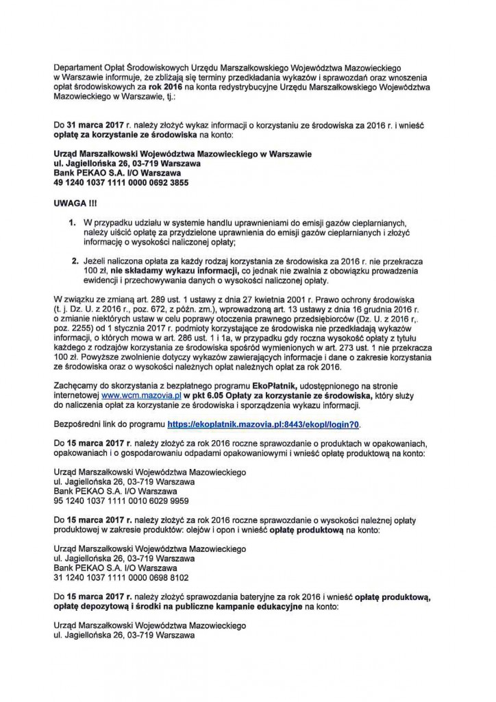 Departament Opłat Środoiwiskowych Urzędu Marszałkowskiego w Warszawie informuje o zbliżających się terminach wnoszenia wykazów i sprawozdań oraz opłat środowiskowych za rok 2016. Szczegółowe informacje na temat instytucji i osób podlegających tym obowiązkom można znaleźć poniżej.