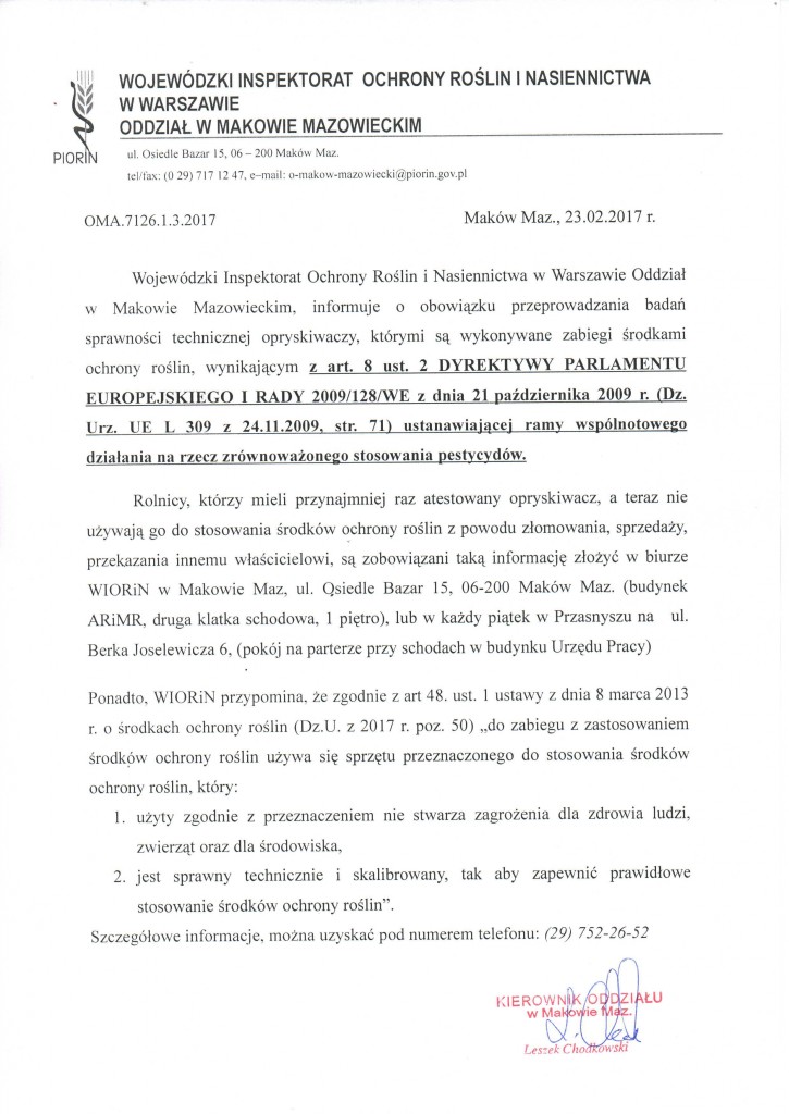 Wojewódzki Inspektorat Ochrony Roślin i Nasiennictwa w Warszawie Oddział w Makowie Mazowieckim informuje o obowiązku przeprowadzenia badań sprawności technicznej opryskiwaczy, którymi bedą wykonywane wiosenne zabiegi ochrony roślin.