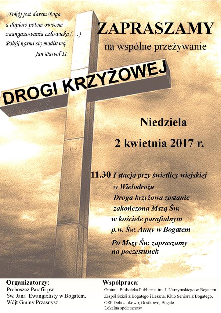 W pierwszą niedzielę kwietnia społeczność gminy Przasnysz będzie mogła po raz kolejny połączyć się we wspólnym przeżywaniu Drogi Krzyżowej. Podobnie jak rok wcześniej, tak i teraz w uroczystej procesji mają pójść reprezentanci wszystkich środowisk gminnych. Tym razem jednak trasa Drogi Krzyżowej będzie wiodła przez Bogate i okoliczne miejscowości.
