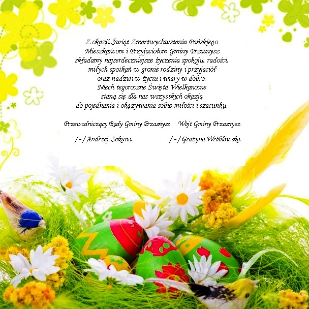 Życzenia od Wójt Gminy Przasnysz Grażyny Wróblewskiej oraz Przewodniczącego Rady Gminy Andrzeja Sekuny na święta wielkanocne.