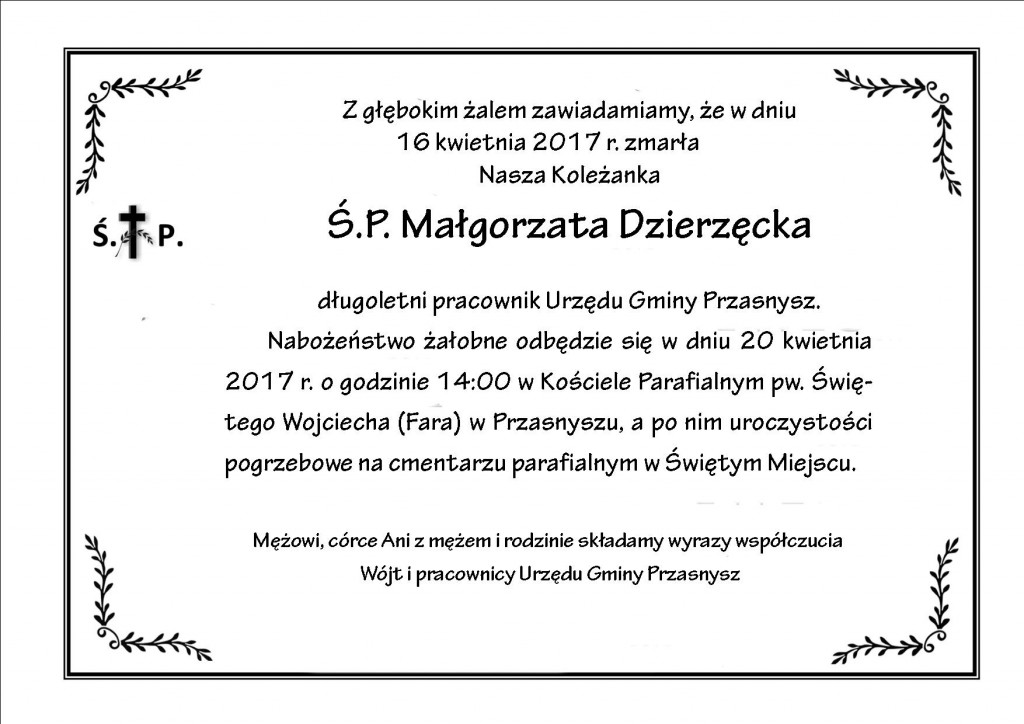 Z głębokim żalem zawiadamiamy, że w dniu 16 kwietnia 2017 r. zmarła śp. Małgorzata Dzierzęcka – wieloletni pracownik Urzędu Gminy Przasnysz, a przede wszystkim nasza droga koleżanka.