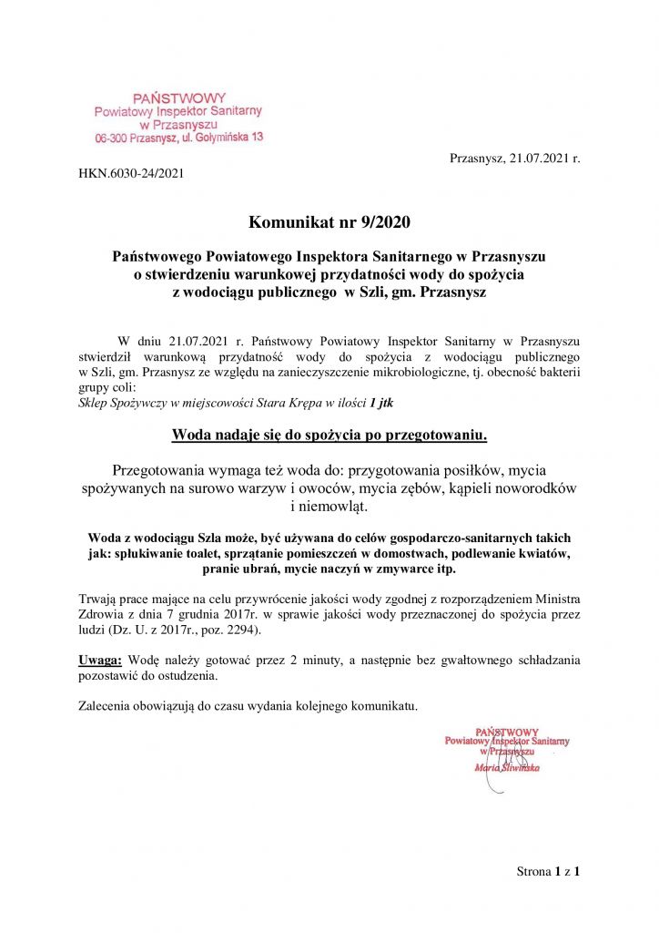 Komunikat Państwowego Powiatowego Inspektora Sanitarnego w Przasnyszu o stwierdzeniu warunkowej przydatności wody do spożycia z wodociągu publicznego w Szli.