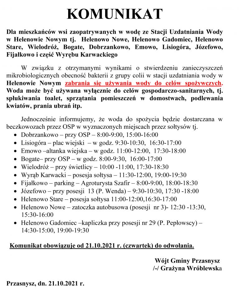 W związku z tym mieszkańcy miejscowości zaopatrywanych z tego ujęcia będą mieli dostarczaną wodę pitną w beczkowozach. Komunikat dotyczy wsi: Helenowo Nowe, Helenowo Gadomiec, Helenowo Stare, Wielodróż, Bogate, Dobrzankowo, Emowo, Lisiogóra, Józefowo, Fijałkowo i część Wyrębu Karwackiego.