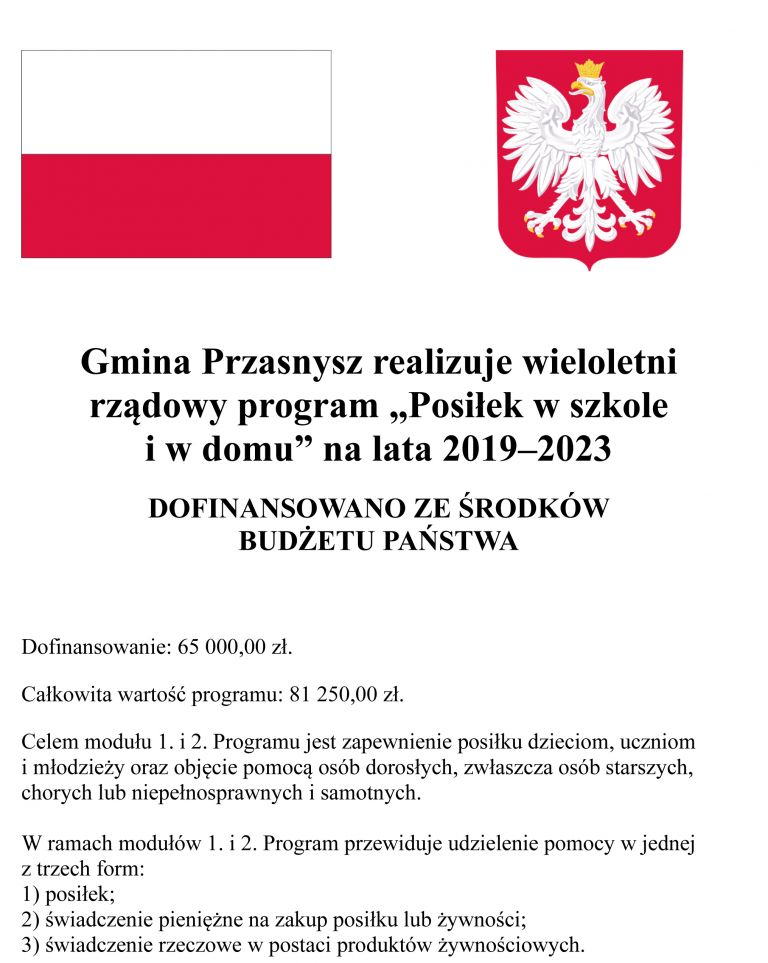 Gmina Przasnysz jest w trakcie realizacji programu "Posiłek w szkole i w domu" realizowanego ze środków pochodzących z budżetu państwa, a także ze środków własnych. Program jest rozpisany na lata 2019-2023.
