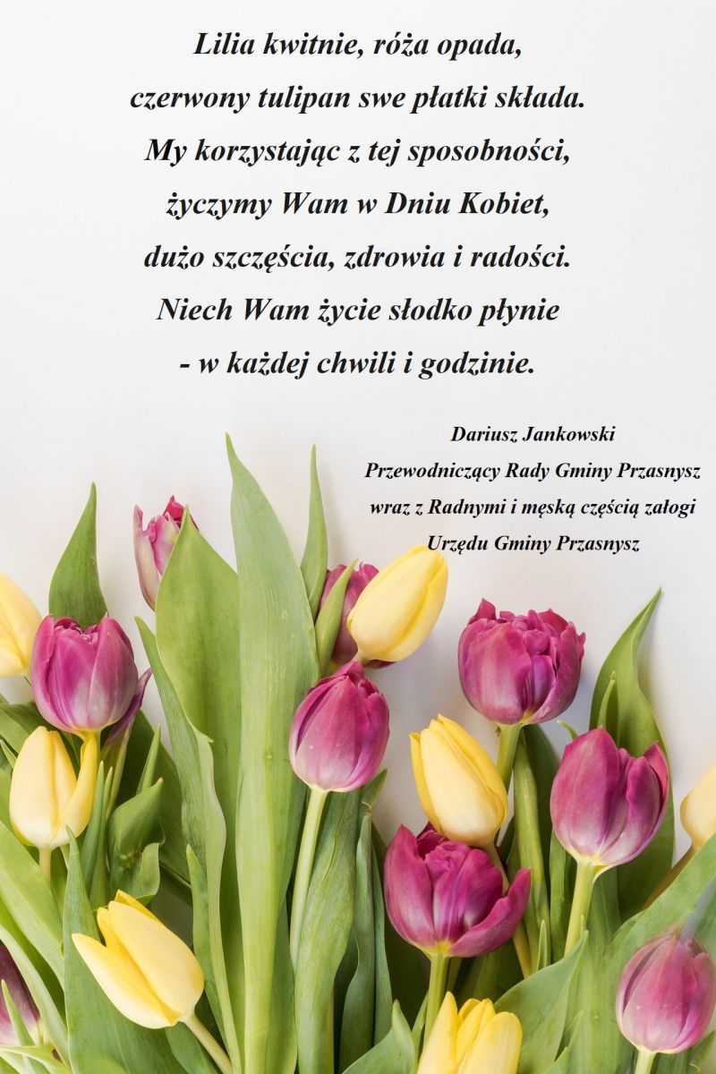 Życzenia z okazji 8 marca od przewodniczącego Rady Gminy Przasnysz Dariusza Jankowskiego, radnych oraz pracowników Urzędu Gminy Przasnysz dla wszystkich mieszkanek Gminy Przasnysz.