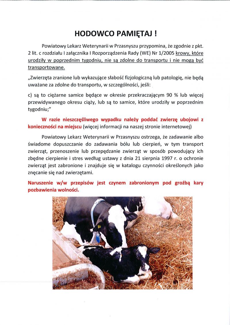 Powiatowy Lekarz Weterynarii przypomina wszystkim rolnikom prowadzącym chów zwierząt gospodarskich o ograniczeniach związanych z transportem krów. Dotyczy to zwłaszcza krów, które są w okresie tuż przed porodem cielęcia lub w ciągu kilku dni po porodzie. Nieprzestrzeganie tych ograniczeń jest zagrożone nawet karą pozbawienia wolności.