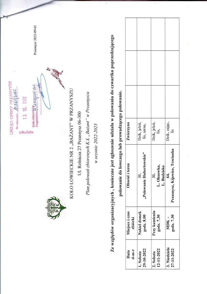 Wójt Gminy Przasnysz podaje do publicznej wiadomości informacje na temat planowanych polowań na terenie gminy organizowanych przez koło łowieckie "Bażant" w sezonie 2022/2023.