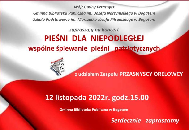 Wójt Gminy Przasnysz, a także pracownicy Gminnej Biblioteki Publicznej im. J Narzymskiego w Bogatem oraz Szkoły Podstawowej im. Marszałka J. Piłsudskiego w Bogatem zapraszają na muzyczne obchody Święta Niepodległości. Wzorem lat ubiegłych zapraszamy mieszkańców do wspólnego śpiewania pieśni patriotycznych w bibliotece w Bogatem. Impreza odbędzie się w sobotę, 12 listopada, od godziny 15.00.