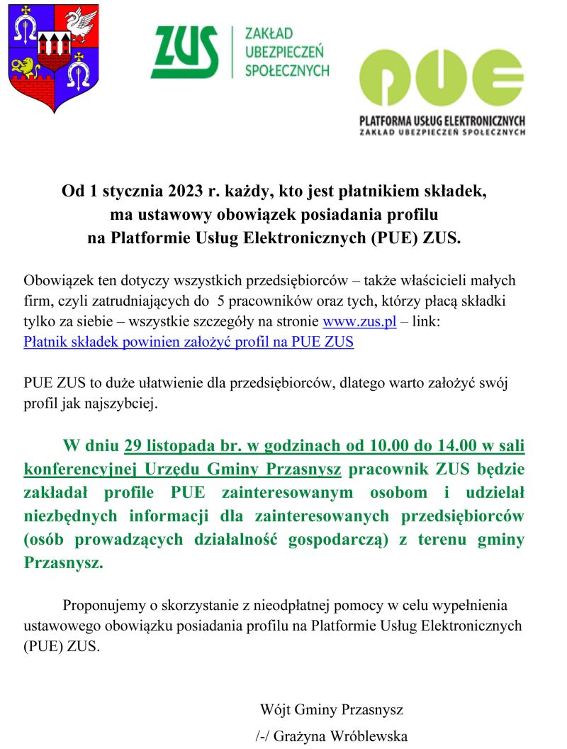 Przypominamy wszystkim mieszkańcom gminy Przasnysz, że od 1 stycznia 2023 r. każdy, kto jest płatnikiem składek, ma ustawowy obowiązek posiadania profilu na Platformie Usług Elektronicznych (PUE) ZUS.