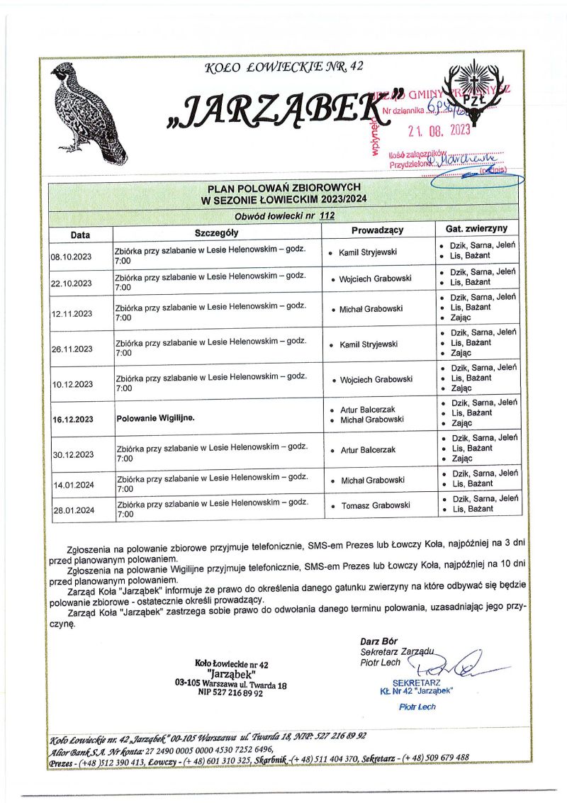 Wójt Gminy Przasnysz podaje do publicznej wiadomości informacje na temat planowanych polowań na terenie gminy organizowanych przez koło łowieckie "Jarząbek" w sezonie 2023/2024.