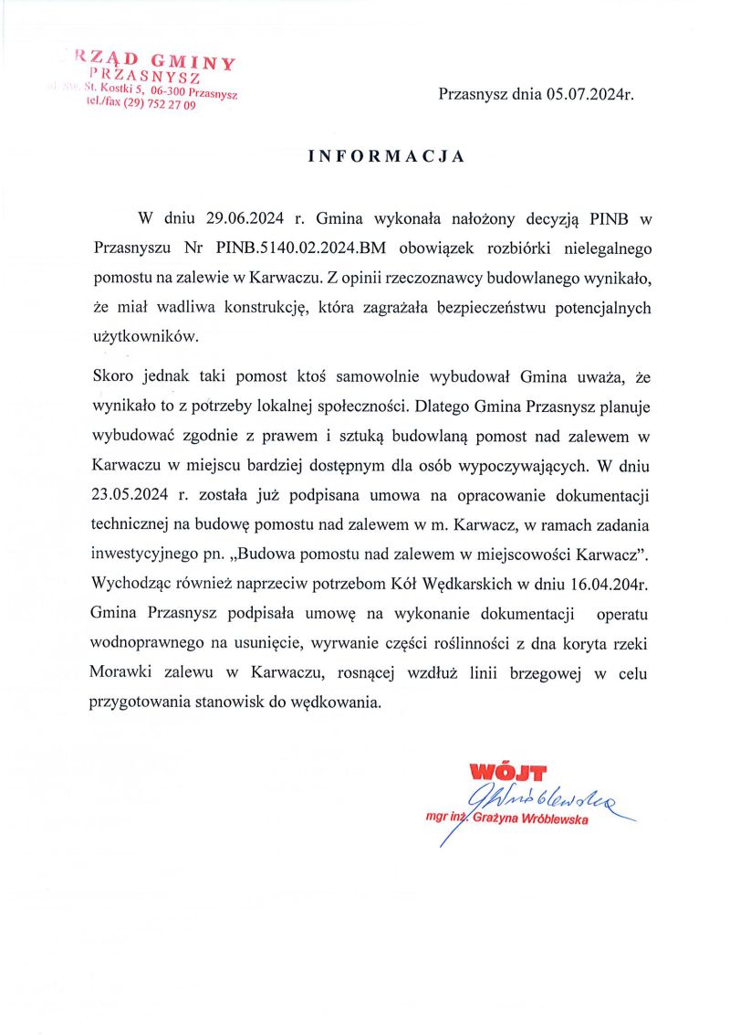 Prezentujemy poniżej informację Wójt Gminy Przasnysz Grażyny Wróblewskiej związaną z budową na zalewie w Karwaczu pomostu, z którego będą mogli korzystać mieszkańcy gminy i całego powiatu przasnyskiego.