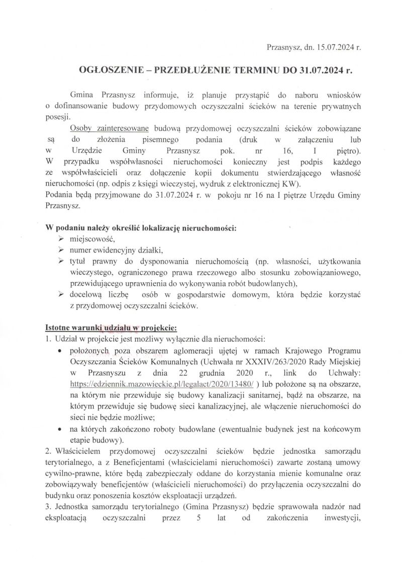 Ze względu na krótki czas pierwotnego naboru Wójt Gminy Przasnysz zdecydował o przedłużeniu terminu składania wniosków na wybudowanie przydomowej oczyszczalni ścieków. Stosowny wniosek będzie można złożyć do 31 lipca.