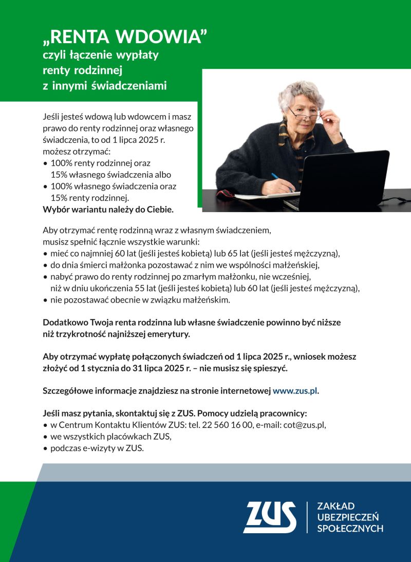 Oddział Zakładu Ubezpieczeń Społecznych w Płocku informuje o zbliżającym się terminie rozpoczęcia naboru wniosków na wypłatę renty wdowiej. Wnioski o ten typ świadczenia będzie można składać już od 1 stycznia 2025 r., a wypłata świadczeń realizowana będzie od 1 lipca 2025 r.