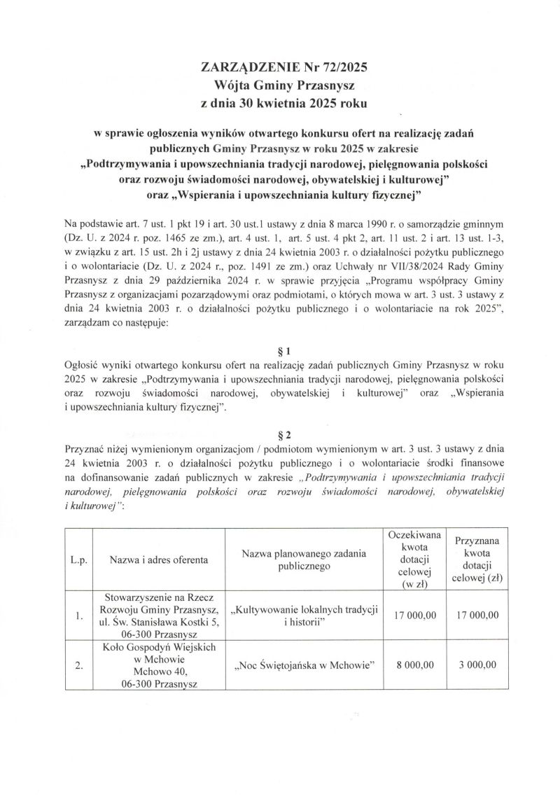 Prezentujemy poniżej wyniki otwartego konkursu ofert dla organizacji pozarządowych działających na rzecz mieszkańców gminy Przasnysz w zakresie Podtrzymywania i upowszechniania tradycji narodowej, pielęgnowania polskości oraz rozwoju świadomości narodowej, obywatelskiej i kulturowej oraz Wspierania i upowszechniania kultury fizycznej.
