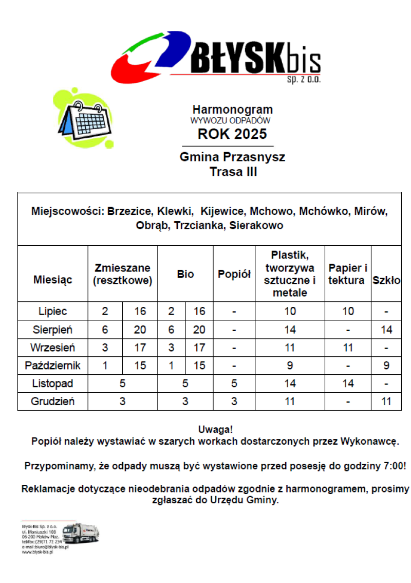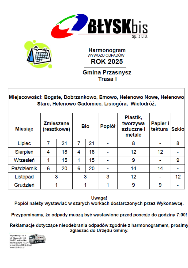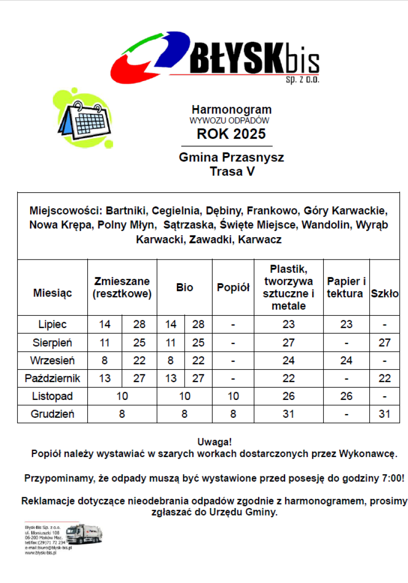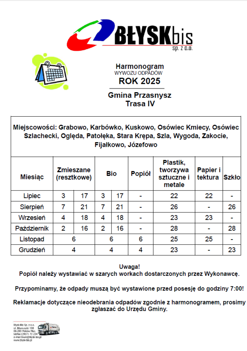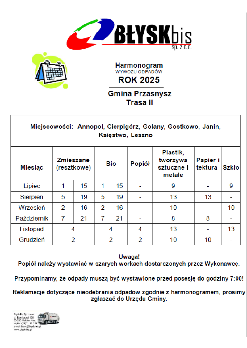 Przedstawiamy w załączniku harmonogram odbioru odpadów z gospodarstw indywidualnych z terenu gminy Przasnysz w drugim półroczu 2025 roku.