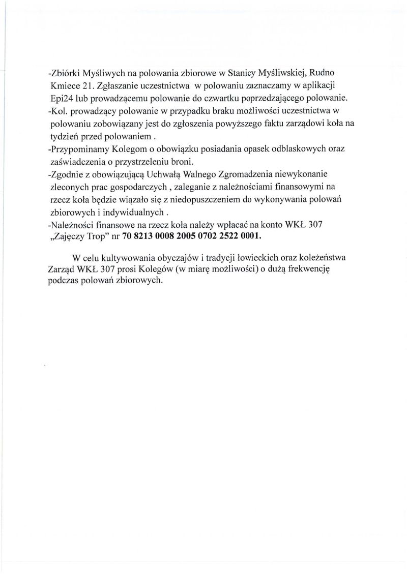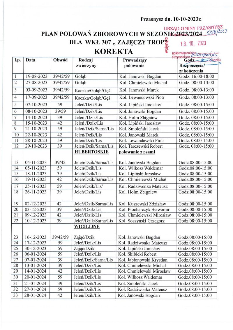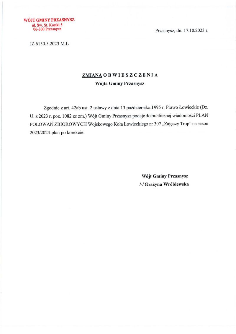 Wójt Gminy Przasnysz podaje do publicznej wiadomości informację o zmodyfikowanym planie polowań na terenie gminy organizowanych przez koło łowieckie ZAJĘCZY TROP w sezonie 2023/2024.